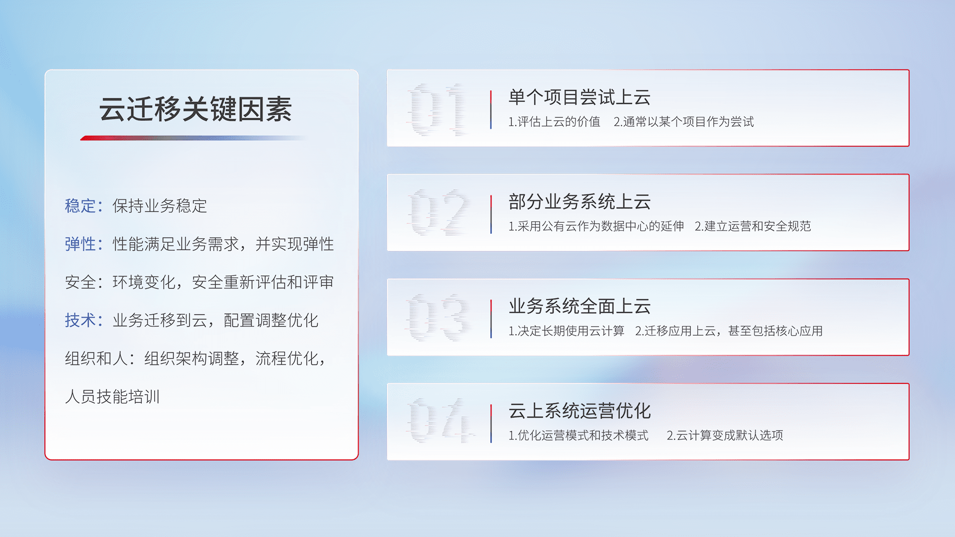 结合实际业务,,,,从规划设计、、云平台选型、、云原生改造、、数据迁移、、集成交付,,,迁移全过程为客户识别最佳上云路径,,,,做好风险识别管理,,,,设计网络架构、、、、身份权限、、安全审计合规、、、、操作审计、、、、日志审计、、监控告警策略、、多站点容灾设计等,,,对云上基础设施进行整体规划,,,,提升IT治理水平,,,以满足弹性、、高可用、、高性能的需求。。